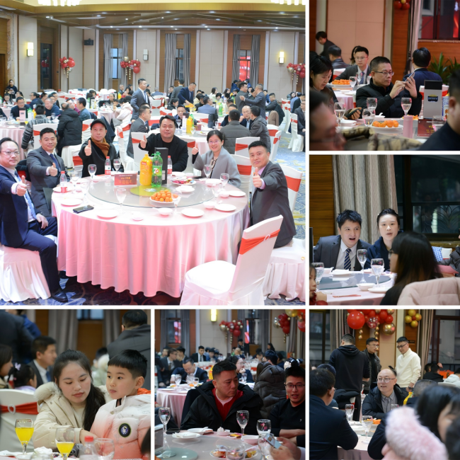 當日下午 3 點,全體移步麗呈君頓酒店開啟年會盛宴。為感恩社會各界、員工家屬支持,公司特邀行業領導、專家及家屬共襄盛舉。員工入場后,紛紛在展廳留影紀念,定格團隊風采;4 點半,嘉賓陸續簽到,高層列隊相迎,親切合影、饋贈禮品。